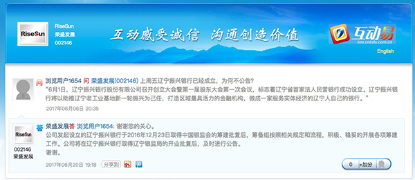6月20日,荣盛发展答复称,公司发起设立的辽宁振兴银行于2016年12月23日取得中国银监会的筹建批复后,筹备组按照相关规定和流程,积极、稳妥的开展各项筹建工作。公司将在辽宁振兴银行取得辽宁银监局的开业批复后,及时进行公告。