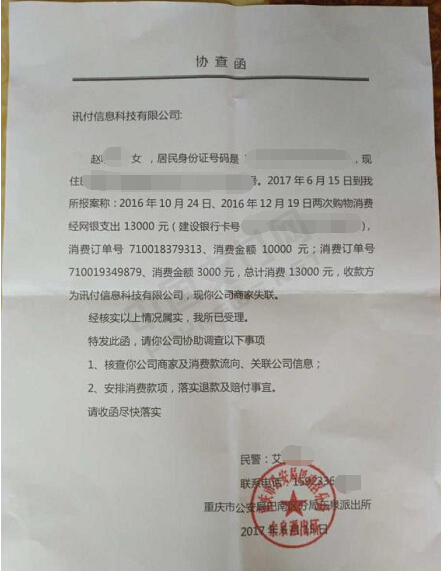 今年5月31日,正在工作的赵女士接到了环迅支付工作人员的电话,该员工表示,根据环迅支付的相关规定,希望赵女士报警后并根据公安指令办理退款赔付事宜。6月15日,赵女士拿到了派出所出示的“报警受案回执和协查函”,并按照环迅支付的要求,提交了相关退款(赔付)材料。但直到现在,又过去了近两个月的时间,赵女士仍未收到环迅支付的赔付款。