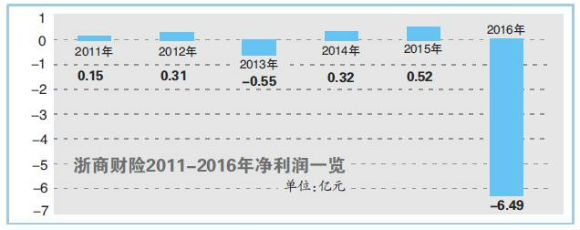 这对于一家净资产仅13亿元的财险公司而言,无异于重大打击。年报数据显示,浙商财险近年来净利润都在1亿元以下波动,2011-2015年,分别实现净利润0.15亿元、0.31亿元、-0.55亿元、0.32亿元、0.52亿元。因为去年踩雷侨兴私募债违约事件,该公司业绩亏损6.49亿元,居财险公司之首。