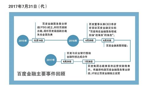 7月28日,在百度2017年第二季度财报电话会议上,百度集团总裁兼首席运营官陆奇透露,将重新构架百度金融服务事业群组(FSG,下称“百度金融”),计划让百度金融独立运营。