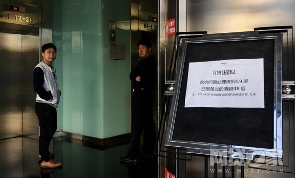 4月18日,北京易到总部大楼门外贴着告示,告示上的文字指引司机前往大厦18层、19层办理提现手续。东方IC资料图