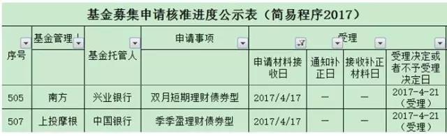 从证监会最新公示的基金募集申请核准进度中可以看到,证监会最近受理的短期理财型基金募集申请还是在今年的4月21日,当天分别受理了南方双月短期理财债券型基金、上投摩根季季盈理财债券型基金2只短期理财型基金,两只产品皆在5月5日第一次反馈意见,截至7月24日,两只产品都还没有获批。