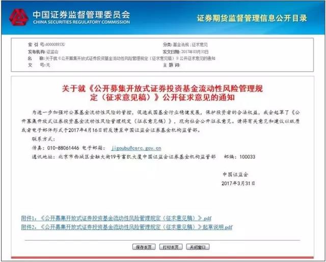 早在今年3月31日,证监会已经发文就《公开募集开放式证券投资基金流动性风险管理规定(征求意见稿)》对外公开征求意见。