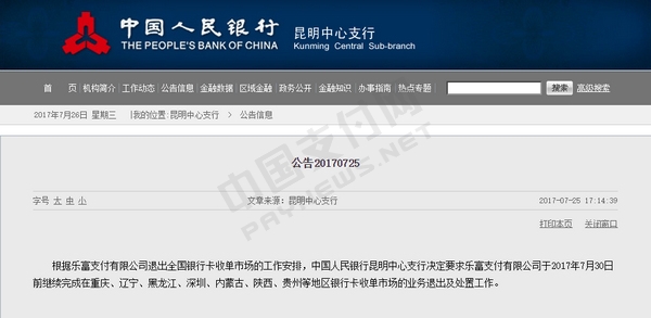 转载请标注:信息网——乐富支付收单业务被央行要求退出深圳等7省市
