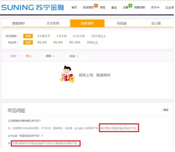 中国基金报记者从苏宁金融官网中发现,该公司旗下的固收理财产品已经全部下线,页面显示为“即将上线,敬请期待”,实际上这类产品早已经有了,只是目前被下线而已。