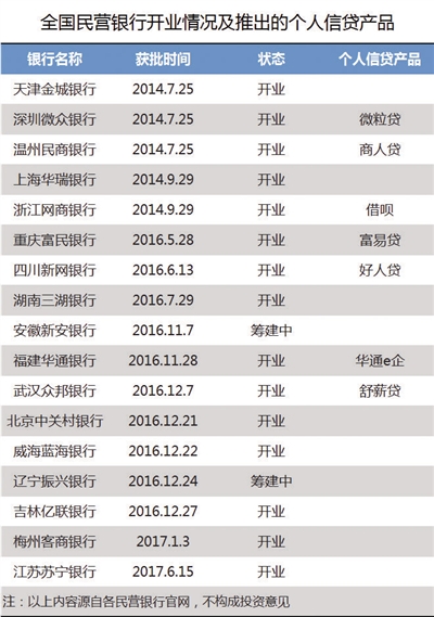 记者注意到,截至目前,共17家民营银行获批筹建,除辽宁振兴银行与安徽新安银行未开业,其他15家均已开业。据相关数据统计,首批开业的5家民营银行中,有3家推出个人信贷产品。后续开业的10家民营银行中,也有4家推出了个人信贷产品。