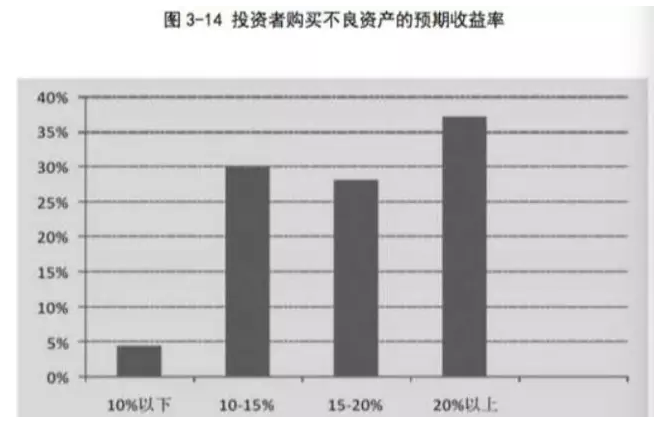 尽管不良资产市场吸引了众多投资者的注意和参与,但这些新型投资者通常对不良资产市场缺乏充足的了解,对不良资产的价值缺乏专业化的判断,其中一个明显表现就是他们对购买不良资产的预期收益率期望较高。从调查情况看,选择15%- 20%和20%以上预期收益率的受访者分别占比28.2%和37.3%。