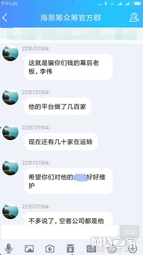 据张女士介绍,王业主曾在海易筹官方群与投资人有过交流,并主动爆料一些意外的事实。5月31日,在海易筹官方群里,王业主称,“骗钱的幕后老板是李伟(X平台法人)。平台做了几百家,还有几十家在运转。”。