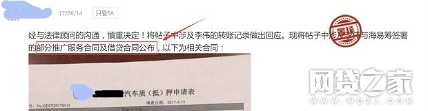 6月14号,X平台在网贷之家社区对帖子中涉及李伟的转账记录做出回应,(点击观看相关帖子)并公布了李伟与海易筹签署的部分推广服务合同及王业主在X平台的借贷合同。