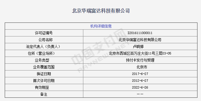 此前,中国支付网曾报道过在华瑞富达官方网站上还发现“北京华瑞富达科技有限公司专注于互联网支付和预付卡发行与受理,致力于打造专业化的消费增值服务平台和福利解决方案。华瑞卡特约商户覆盖中国石油加油站、沃尔玛、国美电器等12个行业700多家商户,华瑞卡业务范围覆盖北京、上海、深圳、郑州、洛阳等城市,并将进一步向全国发展,为持卡人提供高端、优质便利支付服务。”这些描述表明,华瑞富达可能涉嫌跨地域超范围经营,因为央行给华瑞富达颁发的支付业务许可证里只有北京区域的预付卡业务经营许可,但华瑞富达在其官网上却称公司还经营互联网支付,并且还把华瑞卡业务扩展到了除北京之外的上海、深圳、郑州等城市。这正是央行花大力气进行的支付专项整治的重点。