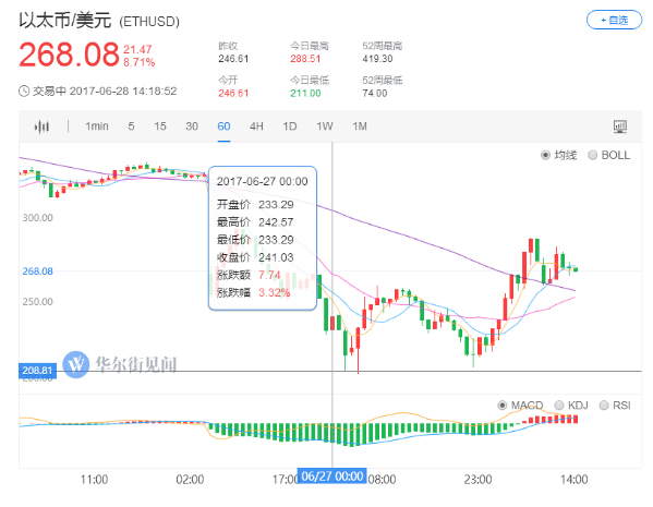 随着新一轮勒索病毒攻击来袭,多个数字货币昨日至今价格大幅波动。北京时间27日,比特币兑美元一度下跌逾5%,随后强势反弹;今日,以太币兑美元上涨逾8%,莱特币兑美元下跌超1%。