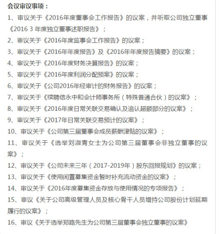 另外,此次乐视网股东大会审议的议案包括:乐视网2016年年度报告、财务决算报告、利润分配预案、董事会工作报告等16项事项。其中两项人事变动议案备受关注,选举刘淑青为乐视网非独立董事与选举郑路为乐视网独立董事,对于融创入局的乐视网十分关键。