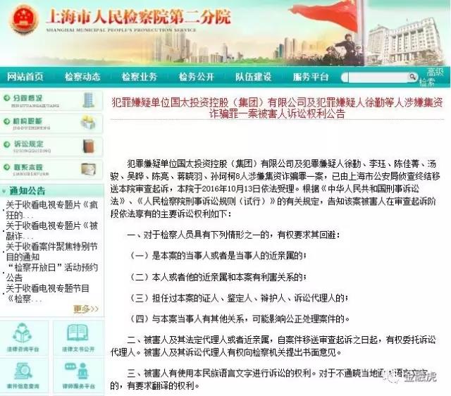2017年2月9日,上海市人民检察院第二分院发布“关于对“中晋系”集资诈骗案提起公诉的公告”。公告称,2017年2月8日,对被告单位国太投资控股(集团)有限公司、被告人徐勤等人以犯集资诈骗罪向上海市第二中级人民法院提起公诉。
