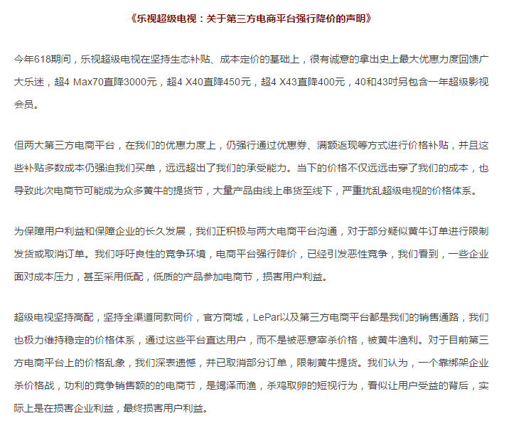 据腾讯科技报道,乐视网市场传播营销高级副总裁、乐视致新CMO任冠军表示,“乐视超级电视坚持生态补贴,坚持成本定价,并且为618已经拿出最大的补贴力度。不想再被刀架在脖子上杀价。我们坚持高配,坚持线上线下同款同价,坚持以最短的销售链条直达用户,电商节不能成为黄牛渔利的黄牛节。利益受伤害的企业不止我们一家,但我们绝不做沉默的大多数。一个电商节,企业连定价权都被剥夺,这是商大欺厂,也是店大欺客。多数企业沉默了,一些企业低质低配降成本杀价格,但这些都不是超级电视的选择。这种病态和畸形的商业环境,必须改变。”