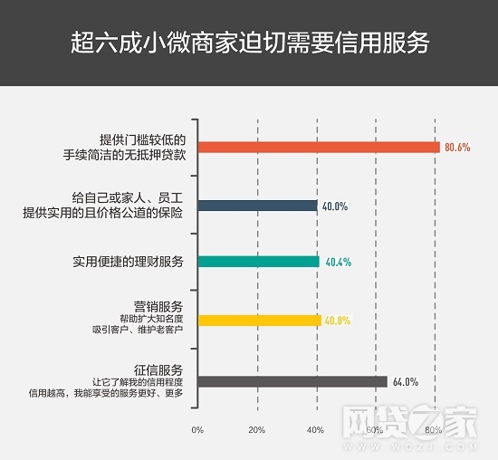 小微商家最需要的是信用、贷款服务。数据显示,80.6%的小微商家最需要门槛较低的、手续简洁的无抵押贷款;64%的小微商家需要信用服务,认为“信用越高,能享受到的服务更好、更多”。