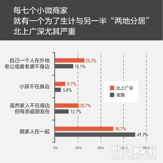 报告显示,在生意伙伴的选择上,42.9%的小微商家选择了“全靠自己”,同时有31.1%的小微商家开的是夫妻店。相比之下,与亲戚朋友合伙做生意的比例略低,约占25%。对于不少小微商家来说,漂泊是一种常态。调研发现15.10%的小微业主与另一半“两地分居”。而北京的小微商家,该项数据更是高达24.2%。