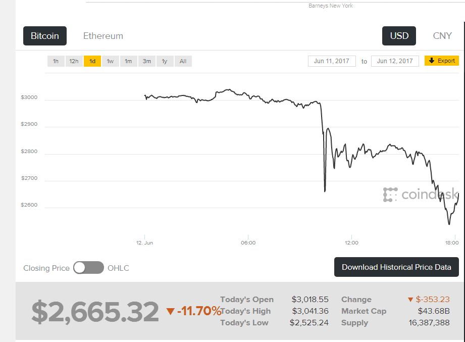比特币大跌14.5%,至2526.4美元,创下2015年1月以来最大跌幅。周日,比特币价格首次突破3000美元,创下历史新高。