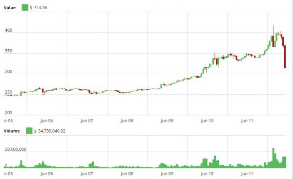 以太币行情今日上演过山车,在升破400美元大关后下跌,跌幅达到15%。