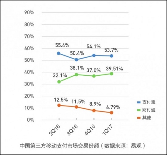 目前,中国移动支付市场几乎由微信支付和支付宝两家垄断。易观智库最新发布的《中国第三方支付移动支付市场季度监测报告》显示,2017年第一季度,中国第三方移动支付市场交易规模达到188091亿,其中支付宝占比53.7%,腾讯财付通为39.51%,两家企业共同占据移动支付市场90%。