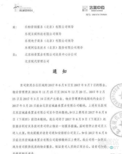 根据网上曝光的通知截图显示,因未按时收到物业管理费、租金及逾期违约费,北京柏豪置业达美分公司、北京现代管理公司向乐帕营销服务(北京)有限公司、乐视互娱、乐视电子商务、乐视网领导发了通知,称如果所欠费用在2017年6月8日前仍未缴纳,员工将被阻止进入大楼办公。但如果能在6月8日前,能够缴纳所欠费用,将继续提供服务。