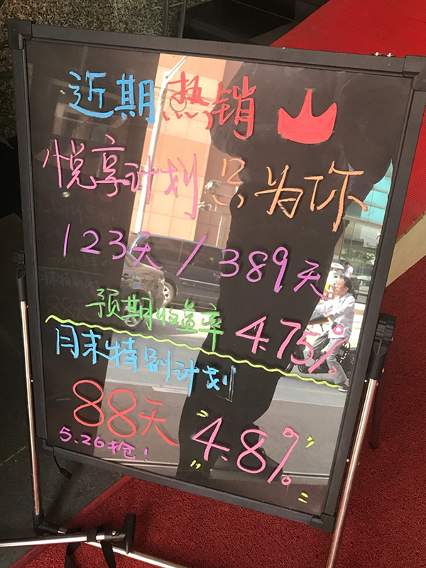 从张贴在这家浦发银行门口的公告栏上可以看出,理财产品的“预计年化收益率”一栏不断被新的贴纸覆盖,而数字也是越来越大。