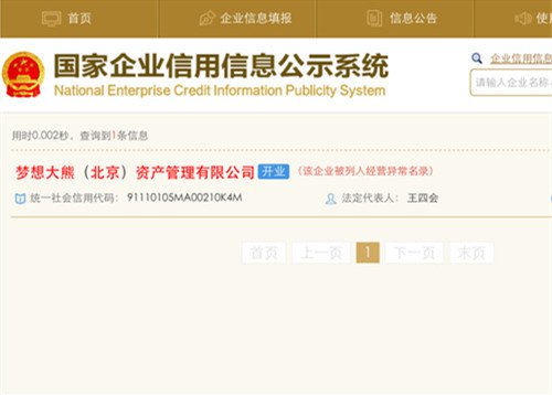 记者在国家企业信用信息公示系统查询到,梦想大熊(北京)资产管理有限公司已被列入工商部门经营异常名录。