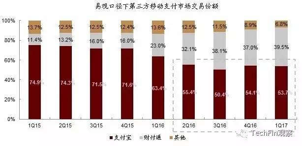 参照易观智库1Q17移动支付市场监测数据,在一季度社交高峰背景下,支付宝移动支付交易额的市场份额环比近乎持平(保持在54%左右),或受益于开放平台策略的成功实施和综合金融服务的有效牵引。实际上,若剔除红包/转账交易额,支付宝的领先优势则更加明显。