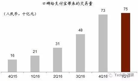 本地生活服务平台“口碑”1Q17给支付宝带来的交易量同比增长257%至750亿元(4Q15~1Q17CAGR:37%)。