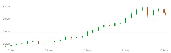 比特币从周四创纪录的高点1848.75美元下跌逾200美元,至上周五的低点1644.64美元。周末,比特币的价格稳定下来,周一的交易价格下跌逾5%,接近1676.42美元。