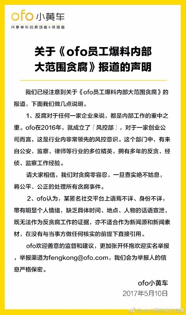 一位电商分析师向《国际金融报》记者透露,其实贪腐在电商企业中并不少见,ofo摩拜等即使有,也不会更加夸张,在信息源未确定的情况下对其大加批判没有必要。