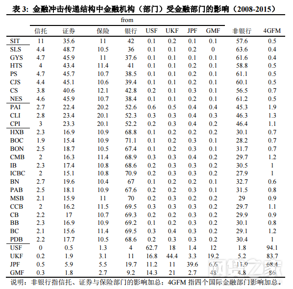 论文援引的测算结果显示,证券行业的金融机构受到信托、保险、银行业的平均影响程度分别约为4.5%、11%和38%;保险行业的金融机构受到信托、证券、银行业的平均影响程度分别约为 3%、23%和 52%;而银行机构受到信托、证券、保险业的平均影响程度分别约为 2.5%、17%和 11%。银行机构受到非银行金融机构的平均影响程度超过30%。