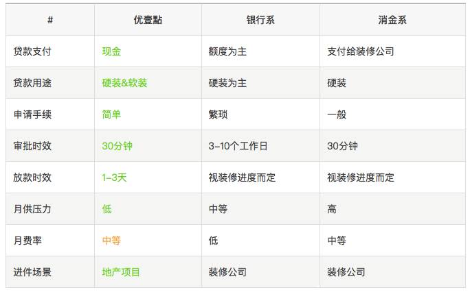 消金系主要特点是和场景绑定的更深、审批快、利息在可接受范围,免息产品需要指定装修公司,用途仅限于硬装,给客户的限制比较大。