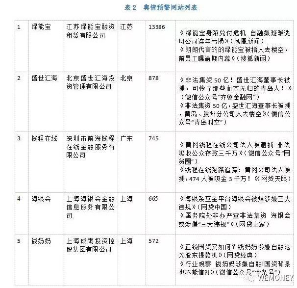 值得一提的是,系统负面舆情指数排名前5名的网站分别为:绿能宝、盛世汇海、钱程在线、海银会、钱妈妈。