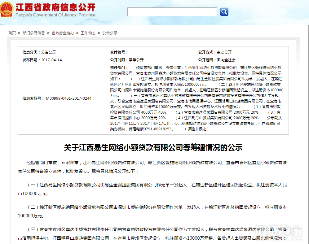 网络整理 2021-03-22 21:39近日,江西省人民政府金融办公室公告显示,批准易生金服控股集团有限公司作为单一发起人,全资设立江西易生网络小额贷款有限公司,注册资本10亿元。