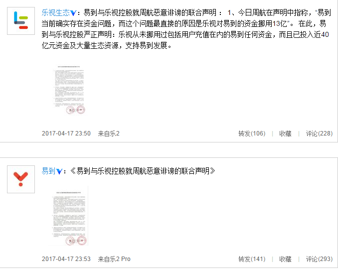 稍后,针对周航声明,乐视生态和易到分别在微博发文,指周航言行为“农夫与蛇现代版”,并预告,关于周航今日诽谤乐视挪用易到13亿资金等各项事宜,今晚易到和乐视控股将联合发布严正声明。