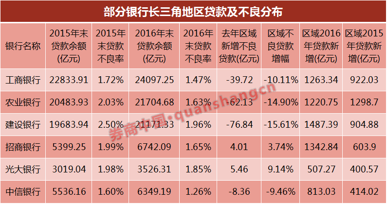 而随着长三角地区不良企稳甚至下降,该区域信贷也在回暖。除交行、浦发缺乏区域分布数据外,其余9家全国性银行在长三角区域的信贷增量均较2015年有所增加,以招行、中信为例,两家银行去年在长三角地区的贷款增量较2015年增量至少翻番。