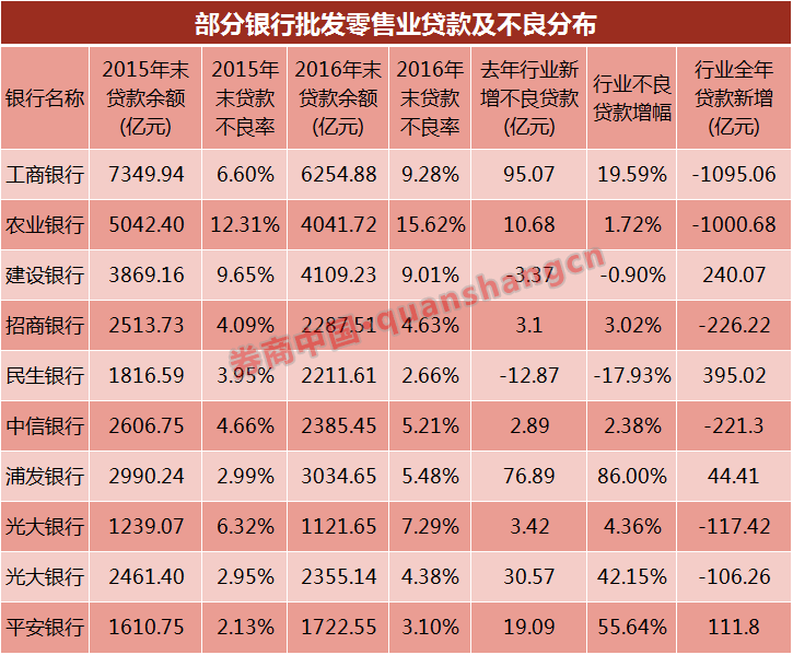 从批发零售业不良增长来看,去年仅有工行、浦发和平安3家银行增幅相对较大,其余银行该行业不良贷款企稳,其中中行、建行、民生行业不良贷款甚至较年初出现下滑。这与2015年各行批发零售业不良贷款激增的情况截然不同。