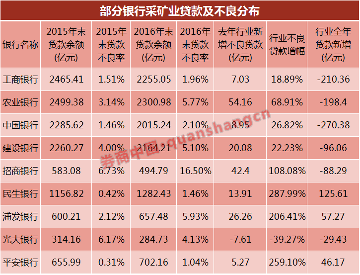 值得注意的是采矿业贷款风险的加速暴露。除缺乏行业分布数据的交行外,其余10家银行采矿业不良整体增幅超50%,民生、平安、浦发3家股份行该行业不良增幅甚至超过200%。
