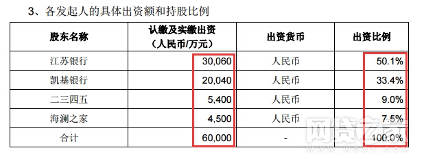 江苏苏银凯基消费金融有限公司发起人出资额及持股比例