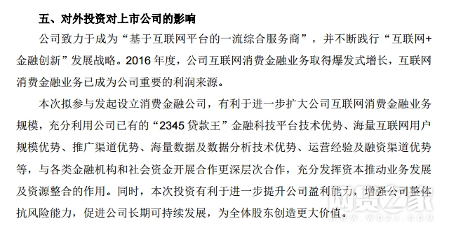 二三四五公司在《关于参与发起设立消费金融公司的提示性公告》中称,此次发起设立消费金融公司有利于进一步扩大公司互联网消费金融业务规模,充分利用公司已有的“2345 贷款王”的各类优势,与金融机构、社会资金开展合作更深层次合作,充分发挥资本推动业务发展及资源整合的作用,有利于进一步提升公司盈利能力。