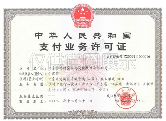 成立于2005年的雅酷时空目前拥有全国范围的互联网支付、移动电话支付和北京市、广东省、江苏省、浙江省的预付卡发行与受理在内的三项业务许可。去年12月,雅酷时空顺利通过央行的续展,有效期更新至2021年12月。