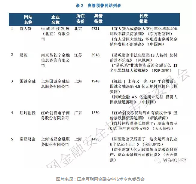 值得注意的是,系统负面舆情指数排名前5名的网站分别为:宜人贷、易乾、国诚金融、红岭创投、诺亚财富。