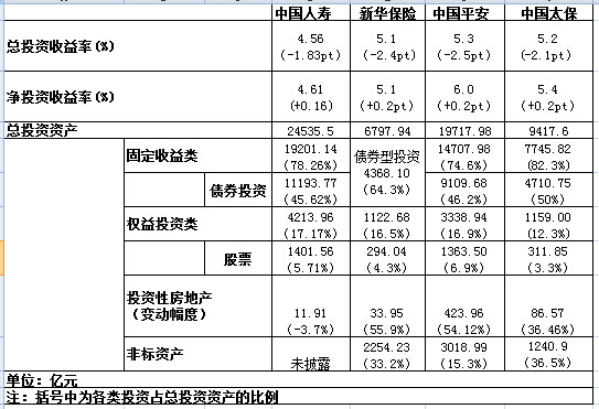 随着中国人寿(601628.SH)、中国平安(601318.SH)、中国太保(601601.SH)、新华保险(601336.SH)四家年报披露完毕,其2016年投资“成绩单”也浮出水面。