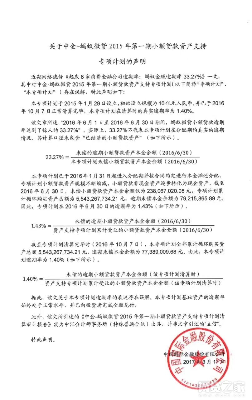 转载请标注:信息网——中金回应蚂蚁金服ABS逾期率33.27%:实为1.4%