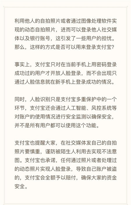 支付宝承诺,任何通过照片处理实现人脸登录,导致账户被盗的,支付宝会全额予以赔付。