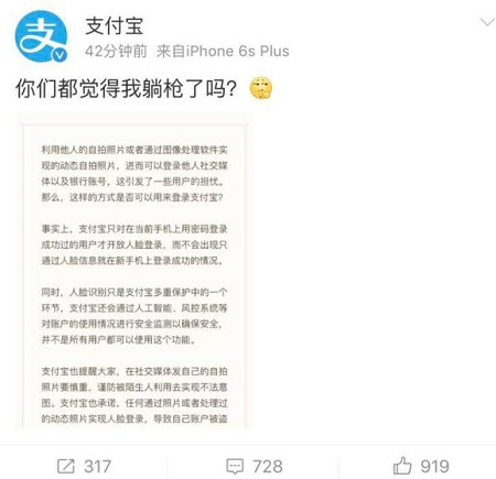 尽管央视并未公布登陆的是哪一个APP,但面对人脸识别登录漏洞引发的用户担忧,支付宝方面随即作出了上述回应,并问“你们都觉得我躺枪了吗?”。