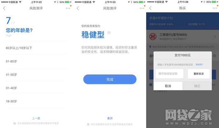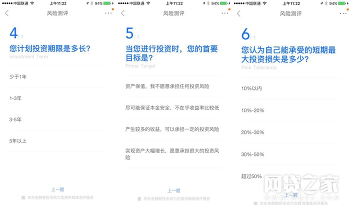 以京东金融的风险测评为例,风险测评一共7个问题,网易科技几乎都勾选了最低选项,其中包括:年收入5万元以下,用于理财投资的资产不超过2万元,投资经验是存银行理财、从未买过其他产品,计划投资期限少于1年,投资时首要目标是资产保值、不愿意承担任何投资风险,自己能承受的短期最大投资损失在10%以内(没有更少的选项),年龄在31—40岁之间。测评结果,网易科技记者的投资类型为“稳健型”,购买京东金融APP上来自金交所的定期理财产品没有障碍,直接就到了支付页面。