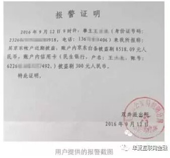 也有多名被盗者称,自己通过与京东反复交涉后,被盗刷的金额清零了,但维权时间会比较长。京东金融要求证明个人白条账户被盗的各种证据:公安报案回执单、手持银行卡正反面照片、本人手持身份证正反面照片、能够体现被盗的银行交易流水等信息。