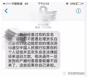 一名白条被盗者给本报记者提供的催收短信指明道姓地称:我已经查过你的实名制,如果你不愿意处理京东白条,那我们就把你的情况资料递交中国人民银行,拉黑你的个人征信并且京东会走法律起诉来追回欠款,相关函件一旦发到你户籍村委居委就撤不回来了,这些后果你自己承担。