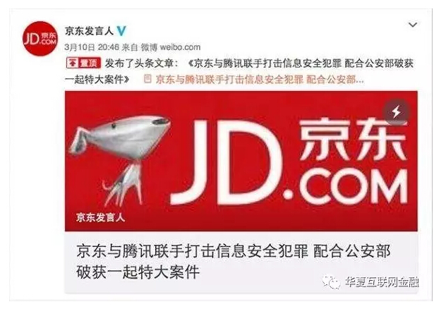3月10日,京东集团发布声明表示,与腾讯联合打击信息安全地下黑色产业链的日常行动中,发现2016年6月底入职京东、尚处于试用期的网络工程师郑某鹏系黑产团伙的重要成员,并立即向公安机关提供了线索。